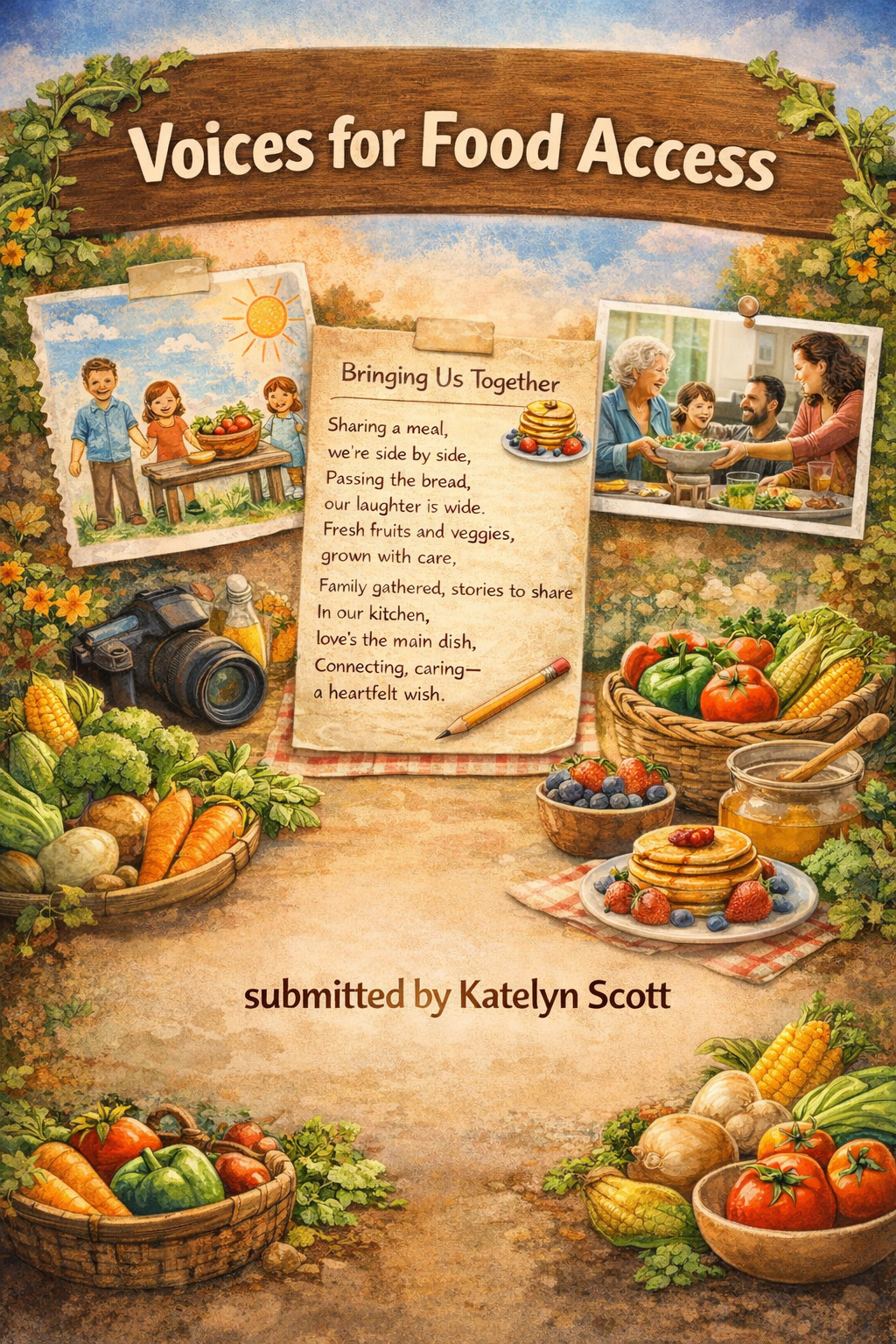 This piece was inspired by the simple but powerful moments that happen around food—shared meals, family traditions, and the ways communities show up for one another. Food is more than nourishment; it’s a connector. I wanted to reflect the warmth of gathering together, the care behind growing and sharing food, and the stories that are passed down in kitchens and at tables. Voices for Food Access gave me the opportunity to visually honor those everyday moments that often go unnoticed but mean everything.