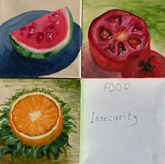 This piece portrays the difference between those who eat well and those who are left out. I wanted to show that some are fortunate enough to have healthy fruits and vegetables that look enticing and the unfortunate people who can't afford them, thus, food insecurity.