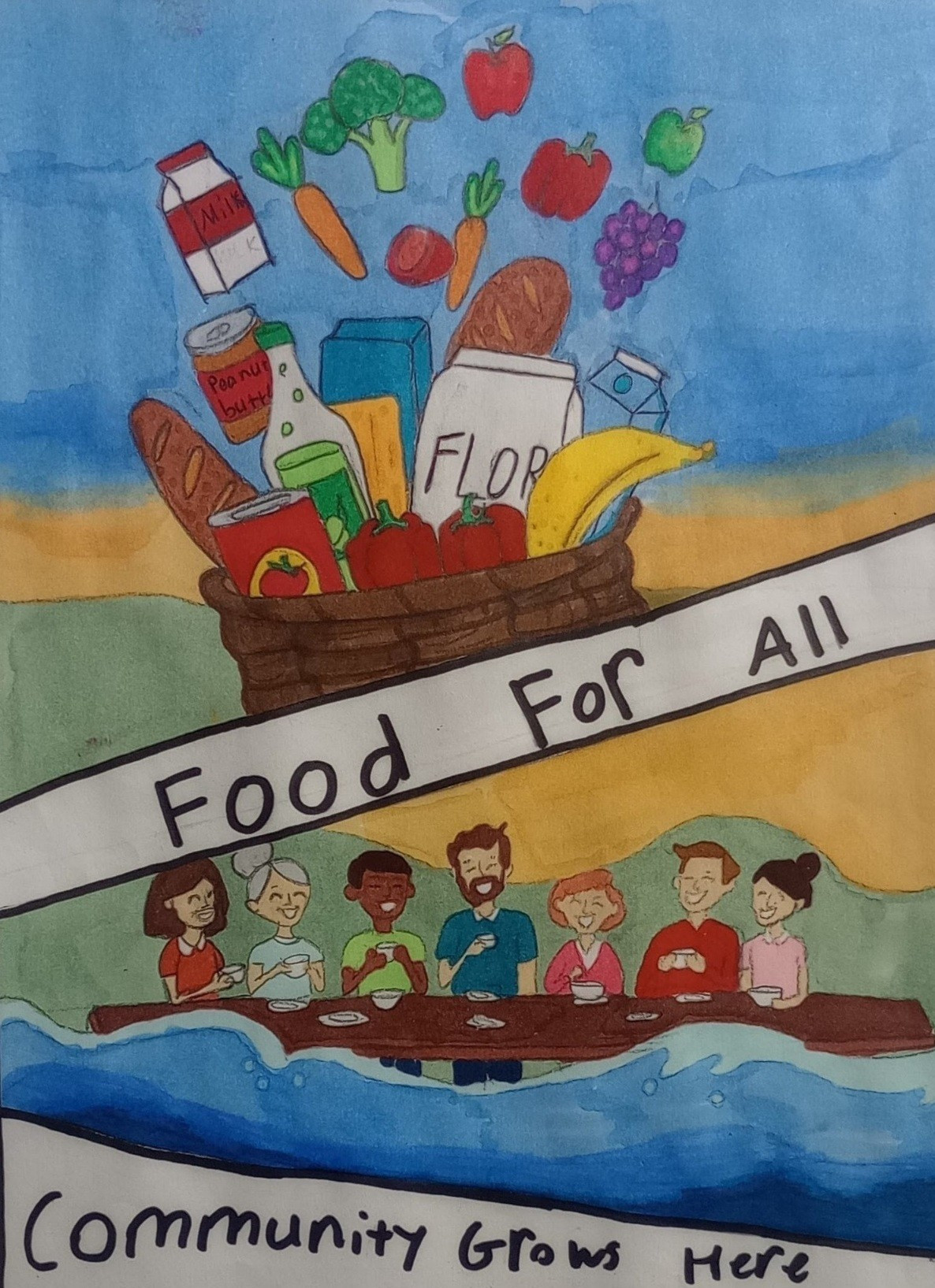 This art work is a symbol of people coming together to enjoy food that we get from our farms and stores that get gathered up and gets dispersed though the community. What inspired me was the food pantry in central lake that is ran by Pastor Garyand how everyone knows each other. I hope when people see this they think about everyone around them and how they come together to help each other.